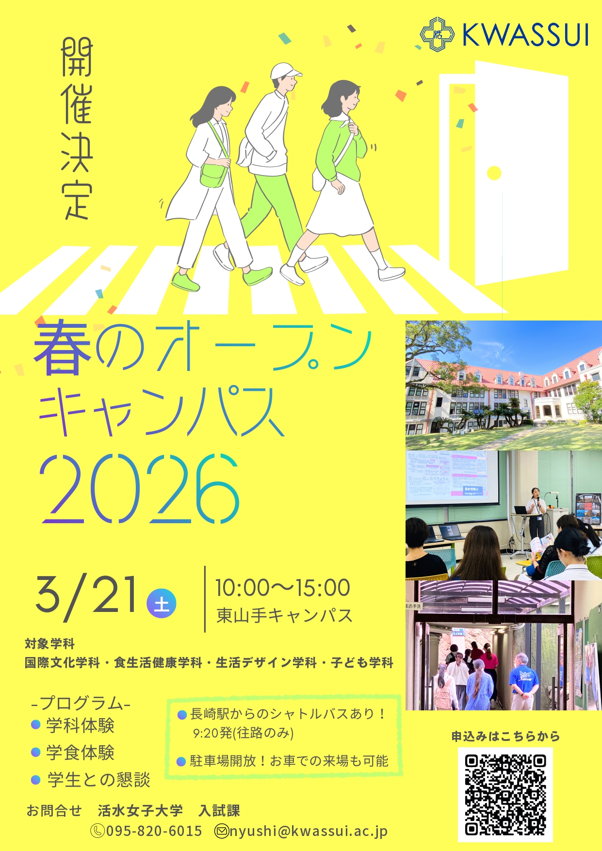 春のオープンキャンパス2026 開催情報 更新!(東山手キャンパス) 投稿公開日:2026.2.17 投稿カテゴリー:open campus 春のオープンキャンパス2026を開催します。 新しい季節、「好き」や「なりたい」を見つけに来ませんか? 高校生の皆さん、保護者の方々のご参加も大歓迎です。 日にち:2026年3月21日(土) 時 間:10時~15時 場 所:東山手キャンパス 対象学科:国際文化学科、食生活健康学科、生活デザイン学科、子ども学科 申込:東山手キャンパスはこちらから (2026年3月18日(水)締切) プログラム等詳細はこちらからご覧ください。 クリックで拡大します。 その他の記事を読む 前の投稿春のミニオープンキャンパス2026 開催情報 更新!(大村キャンパス) 次の投稿一般選抜(共通テスト利用)C日程インターネット出願登録について