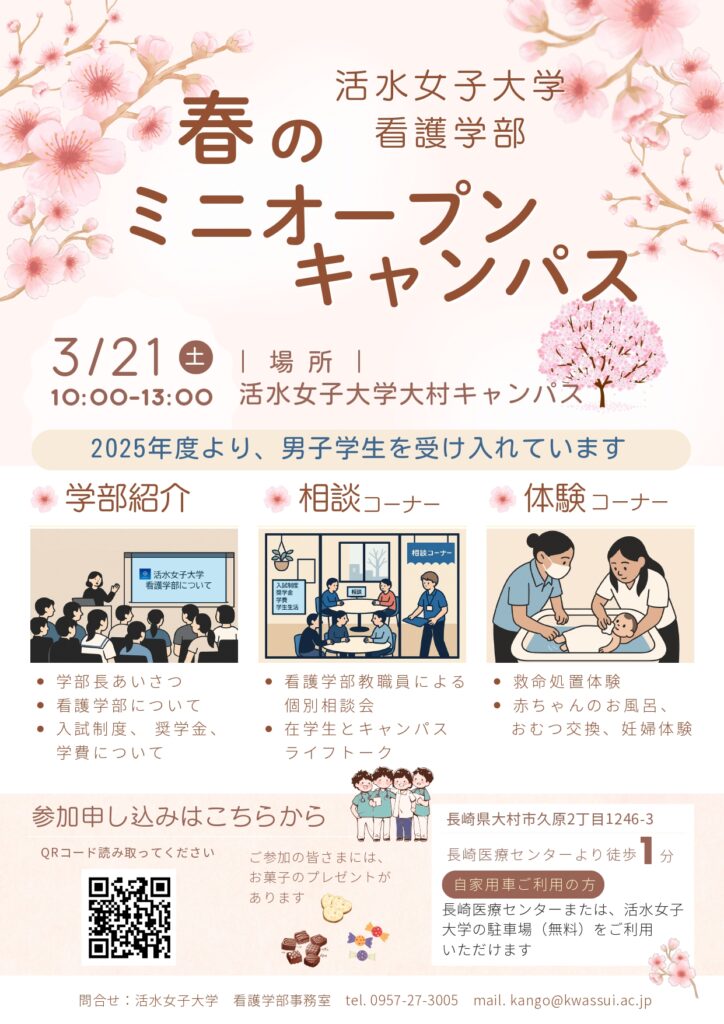 春のミニオープンキャンパス2026 開催情報 更新!(大村キャンパス) 投稿公開日:2026.2.17 投稿カテゴリー:open campus 春のミニオープンキャンパス2026を開催します。 「看護師、保健師になりたい」 その想い、ここから一歩始めてみませんか? 高校生の皆さん、保護者の方々のご参加も大歓迎です。 日にち:2026年3月21日(土) 時 間:10時~13時 場 所:大村キャンパス 対象学科:看護学科 申込:大村キャンパスはこちらから (2026年3月18日(水)17:00締切) プログラム等詳細はこちらからご覧ください。 クリックで拡大します。 その他の記事を読む 前の投稿2026年度総合型選抜エントリー情報 次の投稿春のオープンキャンパス2026 開催情報 更新!(東山手キャンパス)