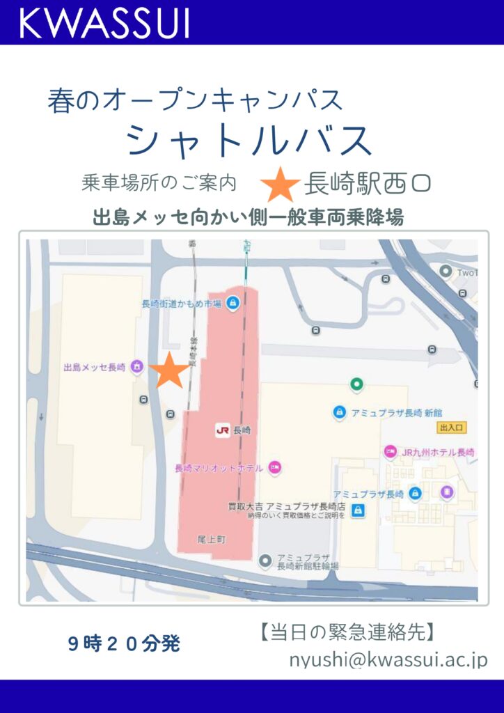 3/21(土) 春のオープンキャンパス バス乗車場所のご案内 投稿公開日:2026.3.19 投稿カテゴリー:お知らせ / open campus 3月21日(土) 春のオープンキャンパス(東山手実施) バスに乗車される方は長崎駅西口、一般車両乗降場までお越しください。 その他の記事を読む 前の投稿活水女子大学は活水大学に名称変更し、共学に移行します
