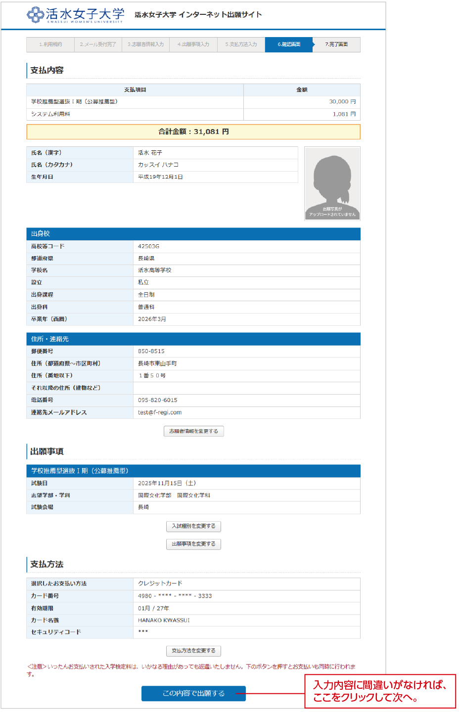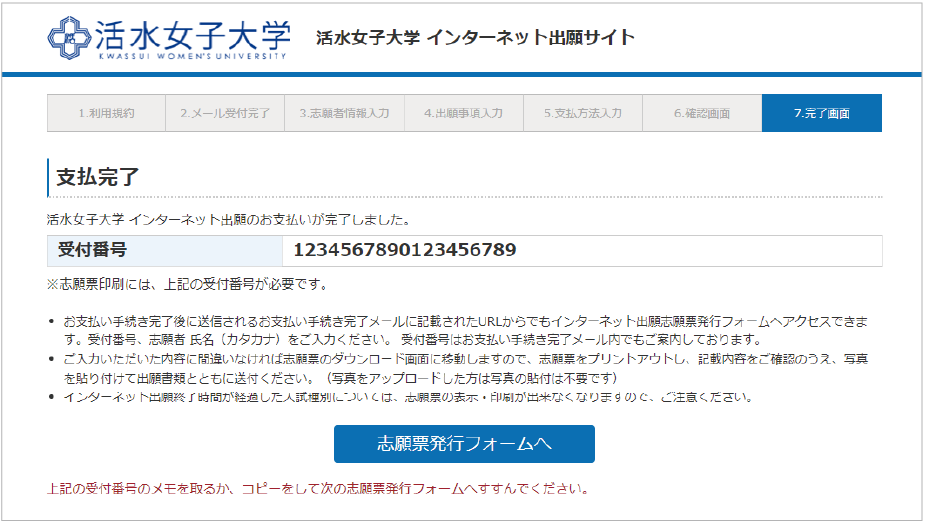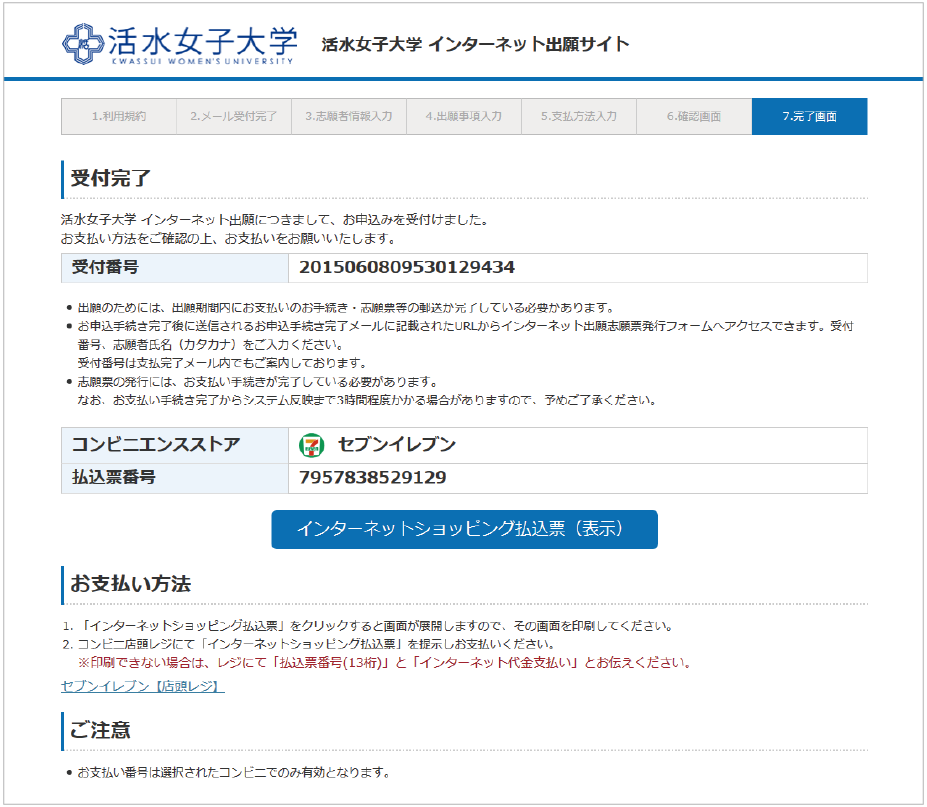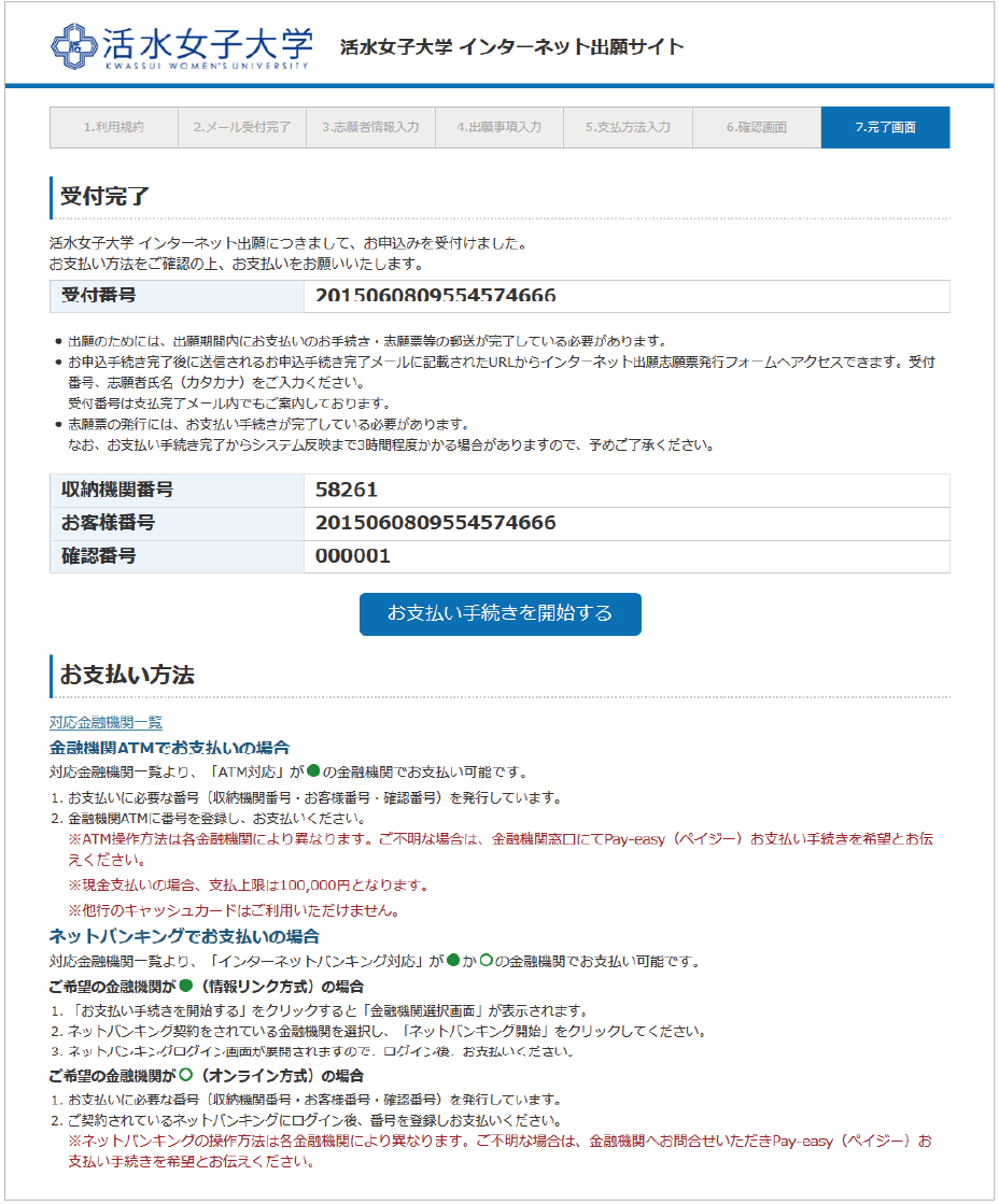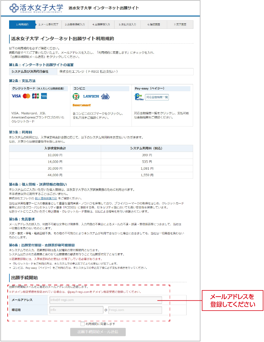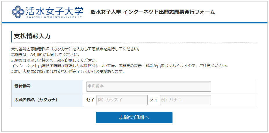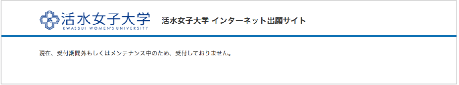 〈目次〉 STEP1 インターネット出願登録方法 ≫STEP1 印刷用PDF(2MB) STEP2 検定料支払い方法 ≫STEP2 印刷用PDF(1MB) STEP3 志願票の作成方法 ≫STEP3 印刷用PDF(1MB) インターネット出願登録方法 1-1 出願期間内に、ホームページにアクセスして、メールアドレスを登録します。https://pay.f-regi.com/fc/kwassui/admission/ 【インターネット出願受付期間外アクセス時】出願受付期間外に本出願サイトにアクセスされた場合、以下の画面が表示されます。 1-2 登録したメールアドレスに「申し込み開始」メールが届きます。 (例:メール文面) 1-3 出願登録をします。必要事項を入力します。(入試種別は、出願時期によって表示が異なります。右図は学校推薦型選抜の画面です。) 1-4 各入試種別において、志望する学科と試験会場を選択してください。なお、一般選抜(共通テスト利用)出願の際は、成績請求票コードも入力してください。 検定料支払い方法 2-1 検定料の支払い方法を選択します。 2-2 登録内容を確認します。 【クレジットカードを選択した場合】 【コンビニエンスストアを選択した場合】 【Pay-easyを選択した場合】 志願票の作成方法 3-1 出願志願票を発行します。 3-2 志願票・写真票を出力(A4用紙)、全ての出願書類と共に、封筒(各自準備)に入れ、厳封の上、「簡易書留」で送付してください。送付の際は、募集要項 P.35の封筒の書き方を参考にしてください。 ①入力した内容が志願票・写真票に反映されているか確認してください。 ②一般選抜(共通テスト利用)に出願される際のみ、共通テストの成績請求チケットを貼付してください。※なお、一般選抜(共通テスト利用)以外の志願票には右図のような貼付欄はありません。 ③ 本学で切り取りますので、出願の際はそのまま切り離さず送付してください。 ④ 写真をアップロードするか、準備した写真裏面に出身高校名及び氏名を明記して貼付してください。 複数学科を併願する場合も、志願票は1枚で結構です。