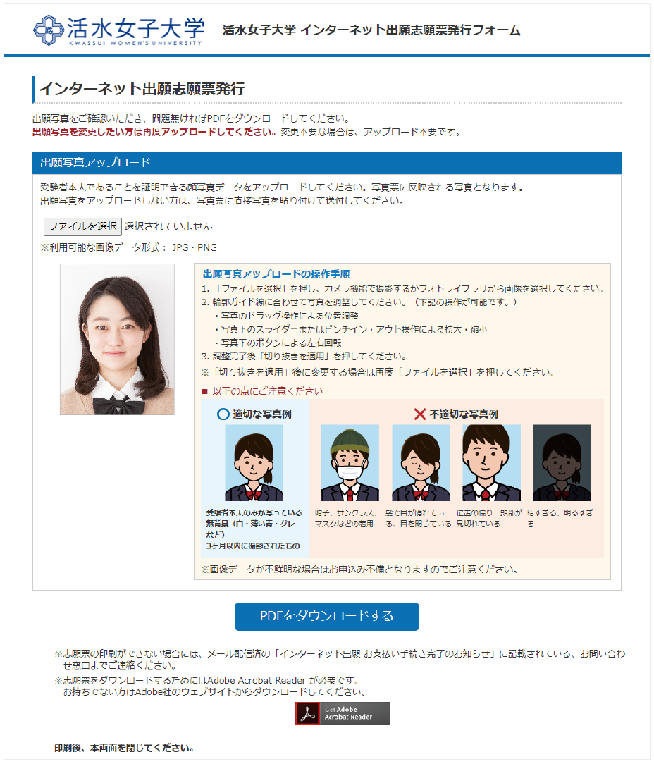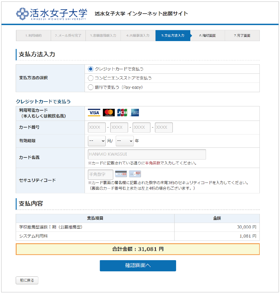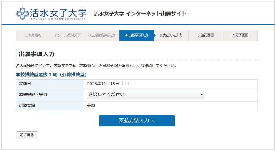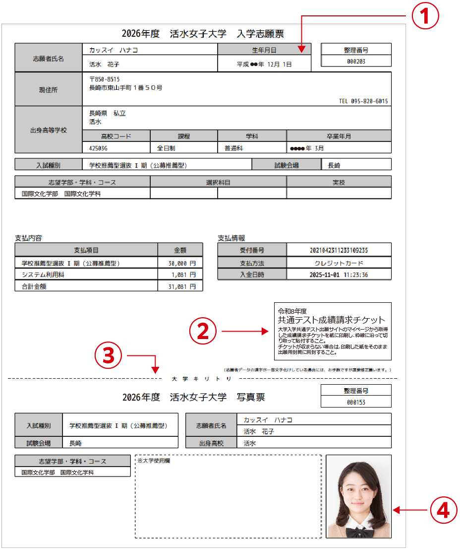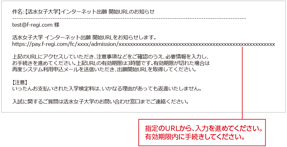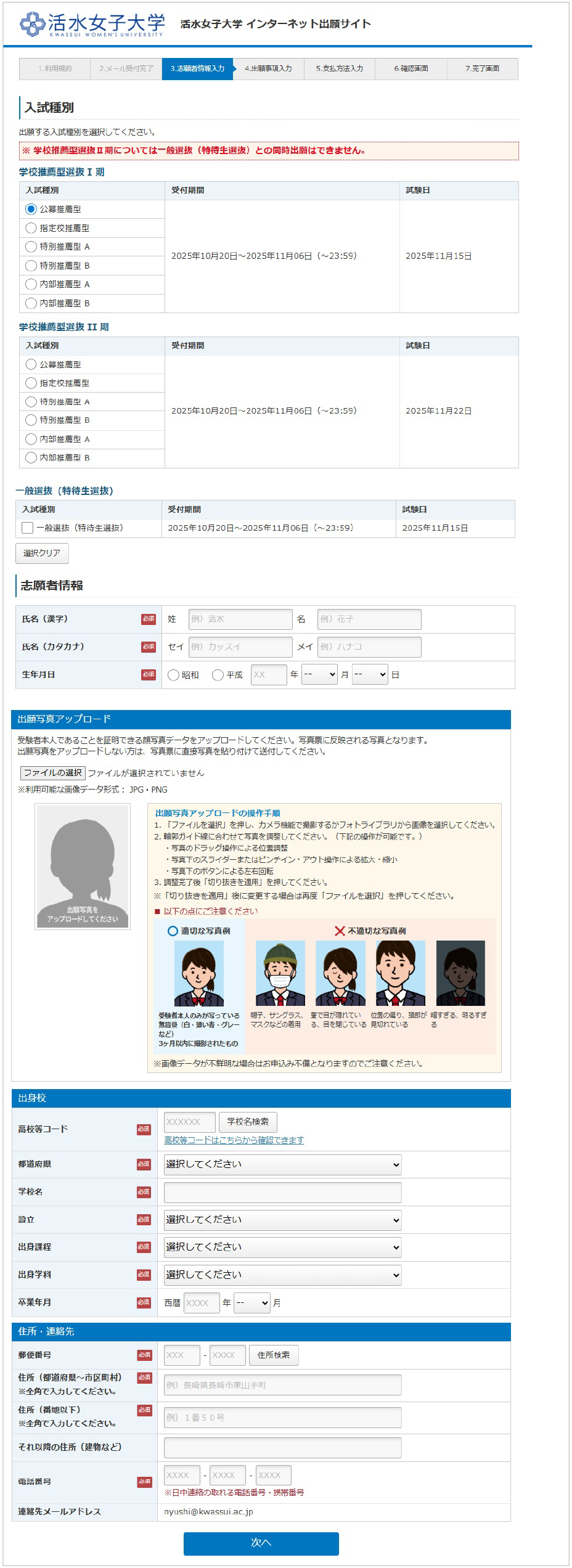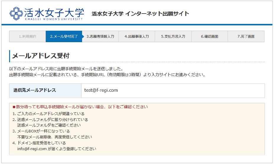 〈目次〉 STEP1 インターネット出願登録方法 ≫STEP1 印刷用PDF(2MB) STEP2 検定料支払い方法 ≫STEP2 印刷用PDF(1MB) STEP3 志願票の作成方法 ≫STEP3 印刷用PDF(1MB) インターネット出願登録方法 1-1 出願期間内に、ホームページにアクセスして、メールアドレスを登録します。https://pay.f-regi.com/fc/kwassui/admission/ 【インターネット出願受付期間外アクセス時】出願受付期間外に本出願サイトにアクセスされた場合、以下の画面が表示されます。 1-2 登録したメールアドレスに「申し込み開始」メールが届きます。 (例:メール文面) 1-3 出願登録をします。必要事項を入力します。(入試種別は、出願時期によって表示が異なります。右図は学校推薦型選抜の画面です。) 1-4 各入試種別において、志望する学科と試験会場を選択してください。なお、一般選抜(共通テスト利用)出願の際は、成績請求票コードも入力してください。 検定料支払い方法 2-1 検定料の支払い方法を選択します。 2-2 登録内容を確認します。 【クレジットカードを選択した場合】 【コンビニエンスストアを選択した場合】 【Pay-easyを選択した場合】 志願票の作成方法 3-1 出願志願票を発行します。 3-2 志願票・写真票を出力(A4用紙)、全ての出願書類と共に、封筒(各自準備)に入れ、厳封の上、「簡易書留」で送付してください。送付の際は、募集要項 P.35の封筒の書き方を参考にしてください。 ①入力した内容が志願票・写真票に反映されているか確認してください。 ②一般選抜(共通テスト利用)に出願される際のみ、共通テストの成績請求チケットを貼付してください。※なお、一般選抜(共通テスト利用)以外の志願票には右図のような貼付欄はありません。 ③ 本学で切り取りますので、出願の際はそのまま切り離さず送付してください。 ④ 写真をアップロードするか、準備した写真裏面に出身高校名及び氏名を明記して貼付してください。 複数学科を併願する場合も、志願票は1枚で結構です。